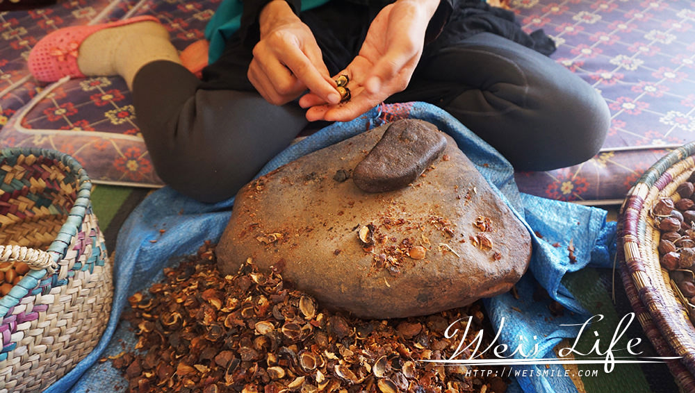 店舖這裡也有一些當地人在這裡現榨製作,每一個摩洛哥堅果可都是要用石頭一顆顆手工敲打,取出摩洛哥堅果後,再敲打,每個果實需要敲打兩次,重點是每個堅果都非常的硬,需要多道手工,相當費時費力,一不小心將會把手指頭給敲腫。