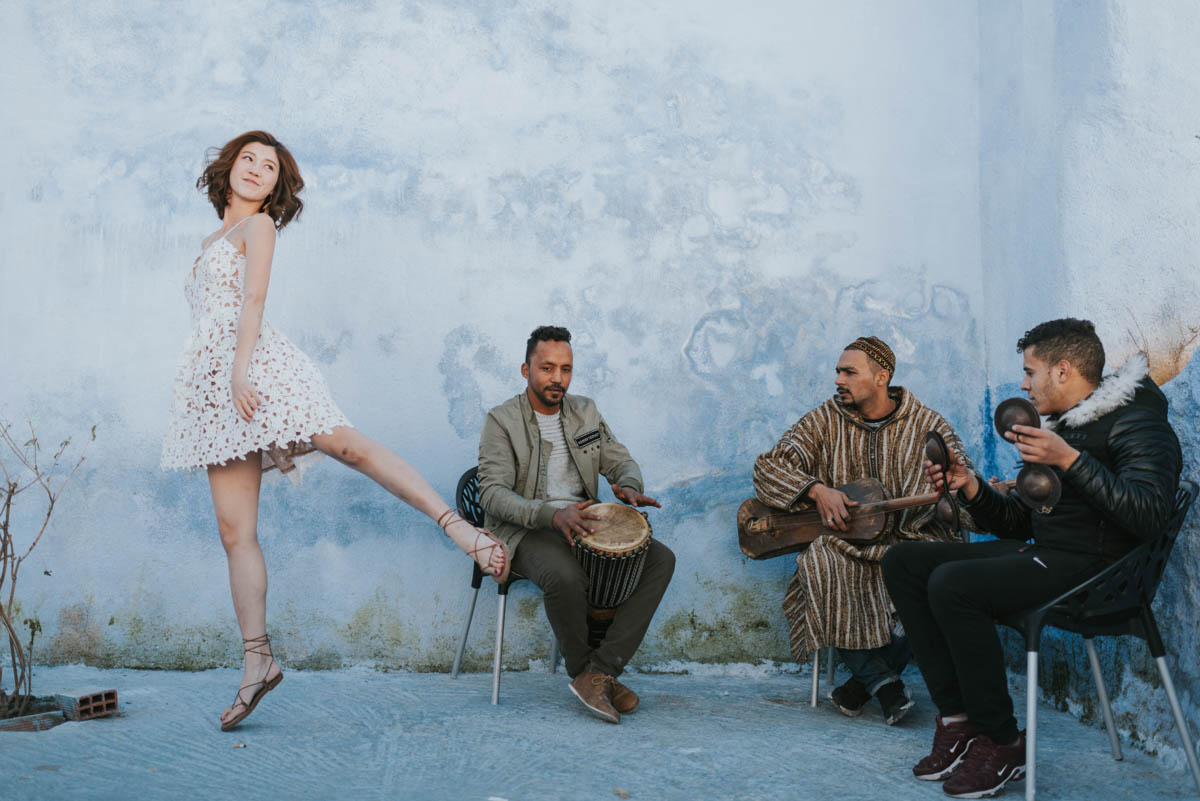 學舞蹈出身的予晞來到了摩洛哥北部山城舍夫沙萬,完全釋放出內心蠢蠢欲動的靈魂,忘情地隨著街邊表演者演奏的輕快音符,輕盈地跳躍在摩洛哥的藍色地中海山城裡,一身輕巧的白色簍空雕花短洋裝,搭配平底羅馬綁帶涼鞋,就像是穿上芭蕾舞鞋不停旋轉的舞伶,躍動在充滿聚光燈的舞台上。