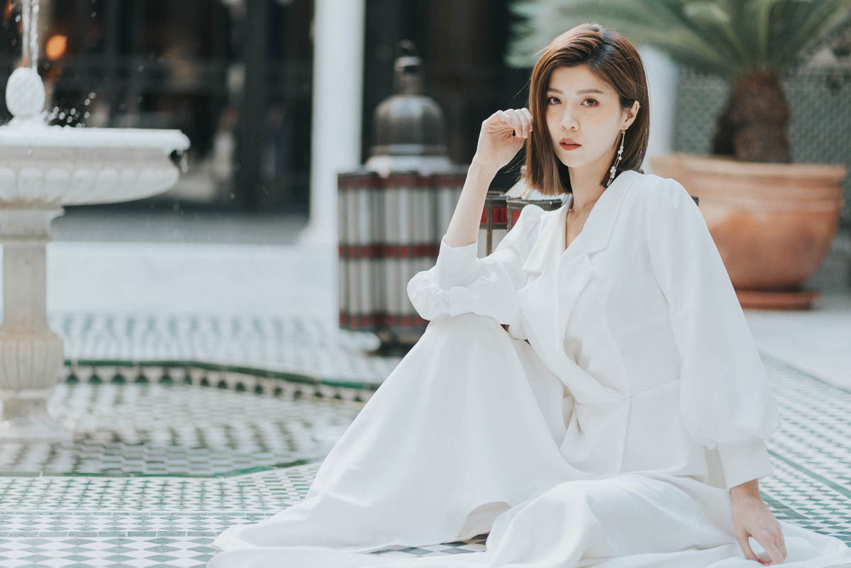 而穿上白色氣質長洋裝帶點宮廷風袖口的予晰,飄逸婉約,透白的肌膚宛如皇室名媛散發著貴族般的氣息,在這浪漫動人充滿馬賽克浮雕的宮廷花園,更顯雍容華貴。女孩們,準備好追隨予晰的腳步在伊斯蘭風情的異國庭園中,演出屬於自己的一千零一夜故事了嗎?