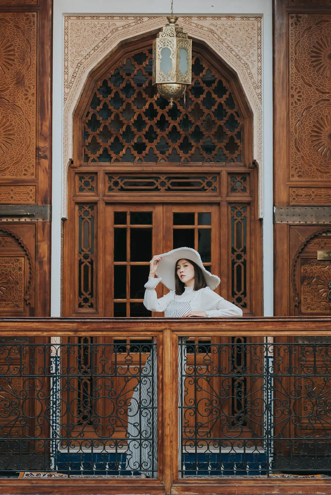 來到有黃色菲斯之稱的非洲最古老中世紀古城,到處可見繁複華麗的雕花裝飾及馬賽克拼貼的清真寺建築,恣意穿梭在如迷宮般錯綜複雜的街弄裡面,彷彿時光倒轉一般,眼前飄過的都是幾百上千年的古蹟,在擁有世界上最古老大學揉合了濃濃阿拉伯風情伊斯蘭老城中,予晞換上了充滿中古歐洲氣息的白色荷葉邊雪紡上衣,搭配時尚的條紋連身褲裝,如英倫淑女般的造型寬帽緣,畫上一抹紅唇,或坐或站在隨意的舉手投足間展現了脫俗的古典氣質。